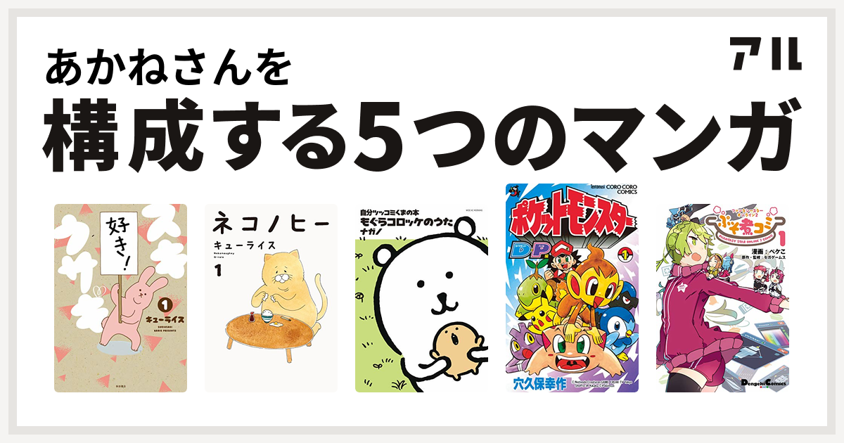 あかねさんを構成するマンガはスキウサギ ネコノヒー 自分ツッコミくまの本 もぐらコロッケのうた ポケモンダイヤモンド パール ファンタシースターオンライン2 ぷそ煮コミ1 私を構成する5つのマンガ アル