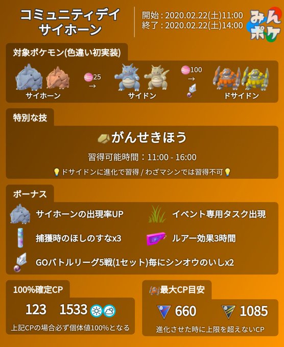 2月22日開催の pokemon go コミュニティ デイ では サイホーン が大量発生 覚えられるわざは がんせきほう