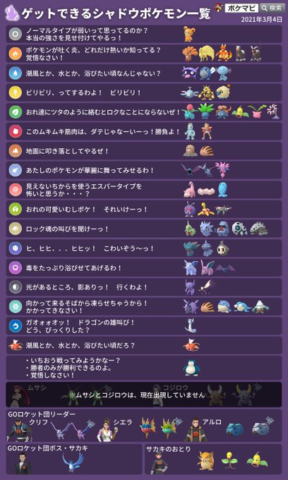 ポケモンgo攻略情報 ポケマピ sur twitter 2020 6 9 火 更新版 ゲットできるシャドウポケモン一覧 保存やシェアなどをしてぜひご活用ください セリフの確認には 下記ページも便利です セリフ別使用ポケモン 対策ポケモン一覧 https t co 1hrh5d8qiq