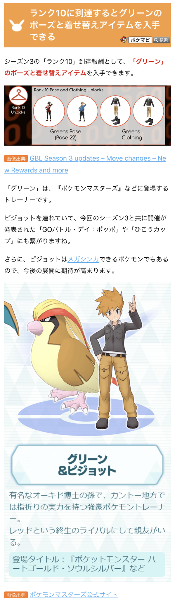 ポケモンgo攻略情報 ポケマピ v tvittere gblシーズン3のランク10到達報酬として グリーン のポーズと着せ替えアイテムが登場 グリーンはピジョットを連れていて goバトル デイ ポッポ ひこうカップ にも繋がりますね また ピジョットはメガシンカ