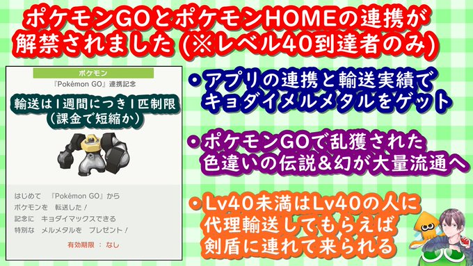 ポケモン剣盾情報 ポケモンスイッチ攻略press on twitter ポケモンgoとポケモンhomeの連携で特別な メルメタル キョダイマックス が入手できます 連携 最初 はトレーナーレベル40が条件 tl40 11 11時点 homeに送るポケモン 転送エナジー の上限あり 幻