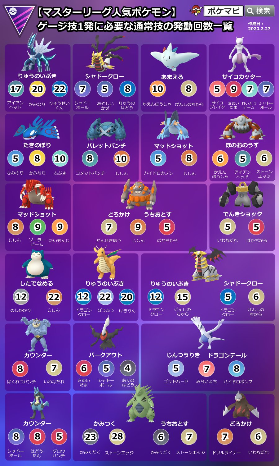 ポケモンgo攻略情報 ポケマピ on twitter マスターリーグ プレミアカップ人気ポケモン ゲージ技1発に必要な通常技の発動回数一覧 スーパーリーグやハイパーリーグ その他のポケモンは 対面早見表で確認できます オプション アイコン表示 ゲージ技発動