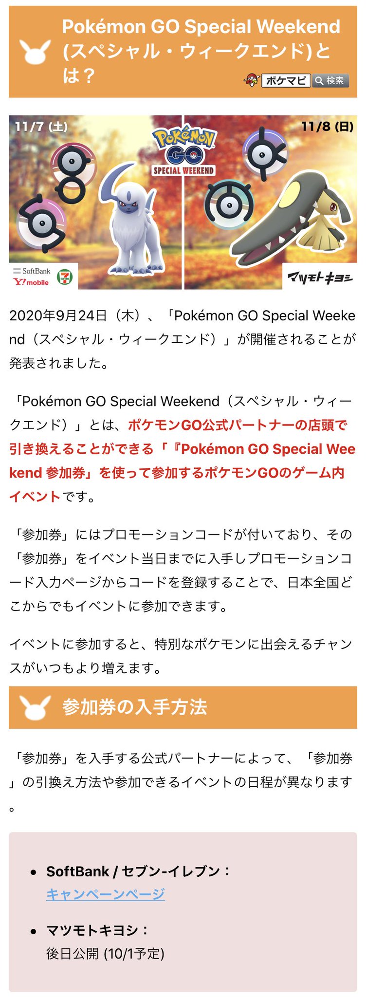 ポケモンgo攻略情報 ポケマピ on twitter special weekend スペシャル ウィークエンド 開催 参加券 が必要 softbank セブン イレブン 2020 11 7 土 11時 14時 アブソル s bアンノーンなど出現 マツモトキヨシ 2020 11 8 日 11時 14時 クチート